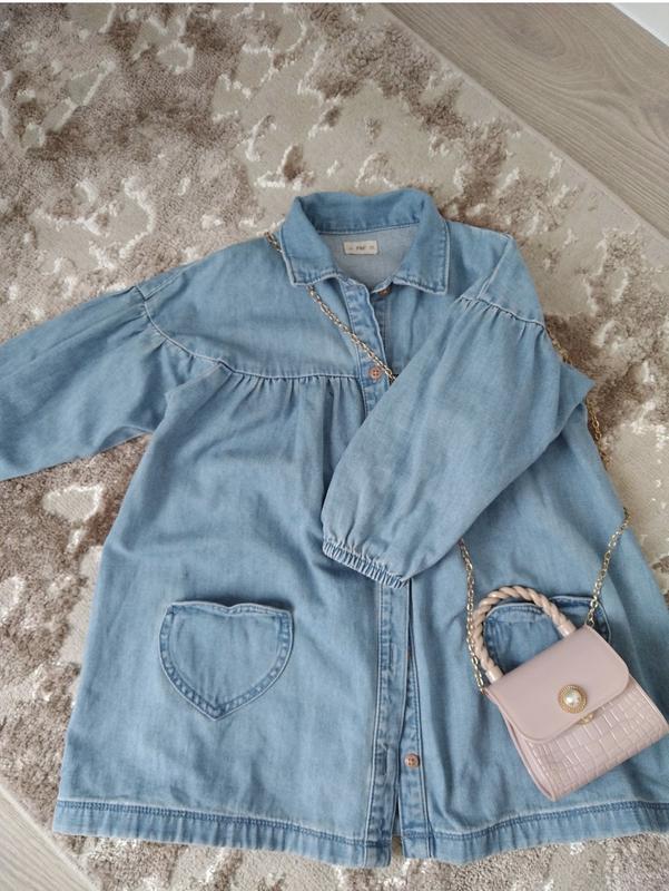 Детское джинсовое платье туника на пуговицах с красивым воротничком и декоративными кармашками в виде сердечек. Очень стильно смотрится с кроссовками по туфелькам