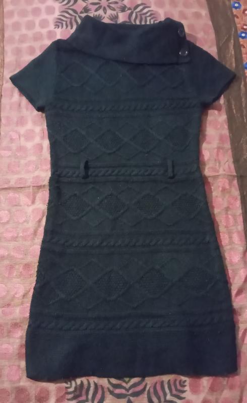 черное вязаное платье-туника с короткими рукавами и узором "косы", предположительно бренда C & A. Детали Стиль: Вязаное платье-туника с высоким воротником на пуговицах и короткими рукавами. Материал: Считается, что она изготовлена из 100% акрила. Узор: Характерный узор "косы" расположен по горизонтали по всей поверхности изделия. Бренд/Вик: подобные модели были идентифицированы как детские (размер 10 лет) бренда C&A, хотя существуют похожие женские варианты от других брендов, таких как Mivonderstood. Этот стиль популярен как теплая повседневная одежда, которую можно носить с леггинсами, колготками и сапогами.