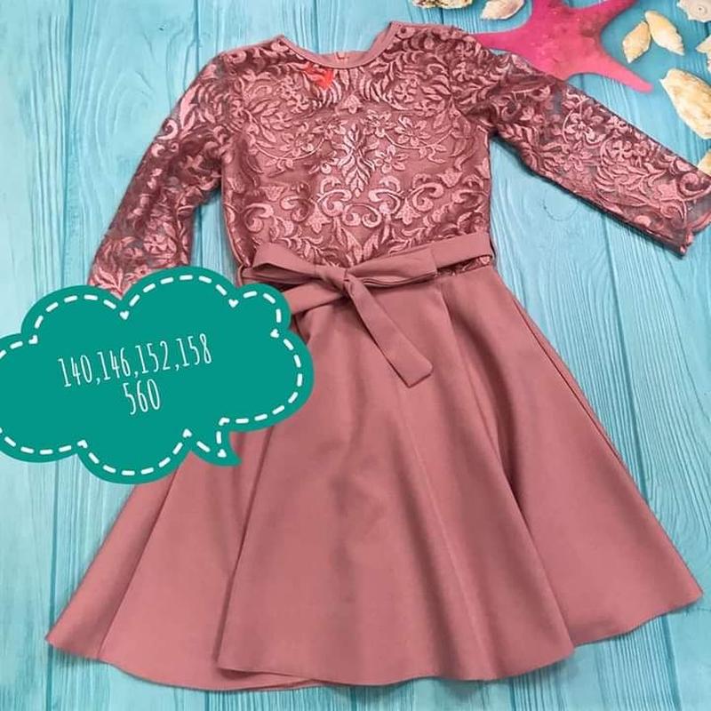 Класичне плаття кольору пудри. Верх ажурний, низ - шовк. Пояс в комплекті