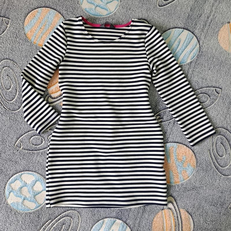 Сукня в чорно-білу смужку для дівчинки на 4-5 років, склад тканини 97 поліестер, 3 еластан. Довжина виробу 53 см, довжина рукава 36 см, ПОТ 30 см, тягнеться.