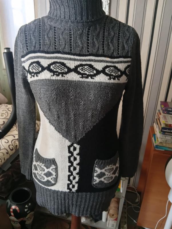 продам платье- свитер,теплое, вязаное, сделано в Турции,бирки с размером нет, в составе 70% акрил, ,30% шерсть,подойдет по размеру где то на XS/S, платье свитер теплое очень, спереди карманы, есть чуть катышек по боковым швам и внутри на рукавах, особо не видно, отдаю дешево, теплое, уютное, цвет насыщенный, темно серый ,с светло серым, хорошо тянется, мягкое,замеры: пог 46 см ++ тянется до 56см, тянется очень хорошо, пот 41 см ++ до 51 см,поб 47 см ++ до 57 см, длина рукава от горловины 74 см, длина по спинке 71 см, полная высота ворота 18 см, идет в два сложения