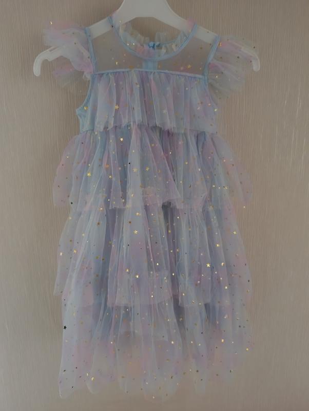 Очень красивое платье нежно голубо-розового цвета, ззади застегивается на молнию, имеет хлопковую подкладку и однослойные фатлиновые рюши которые украшены золотистыми звездочками и месяцами. замеры длина изделия 64 см, ПОГ 31 см.