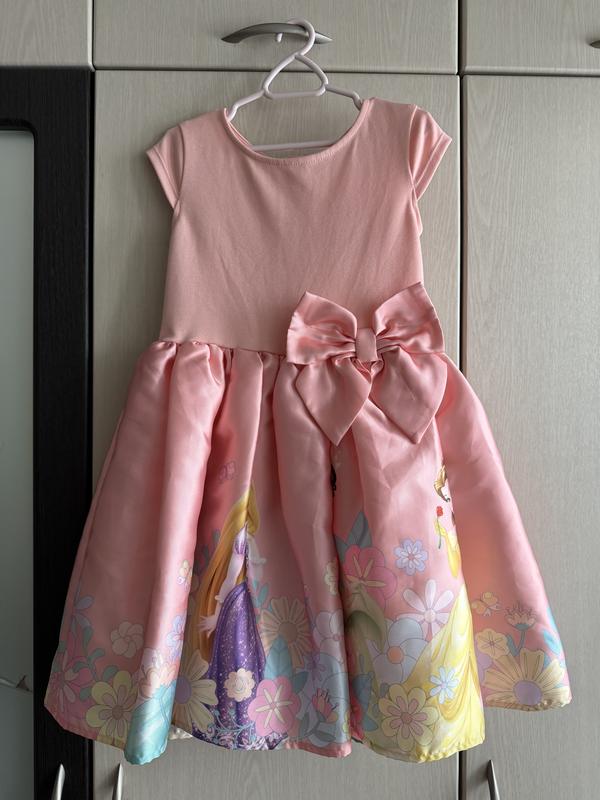 Фирменное нарядное платье для девочки, размер указан 4-6 лет, очень красивое, любимые персонажи из мультфильмов Disney, сзади на молнии, впереди красивый бант, есть подьюбник, пышное.