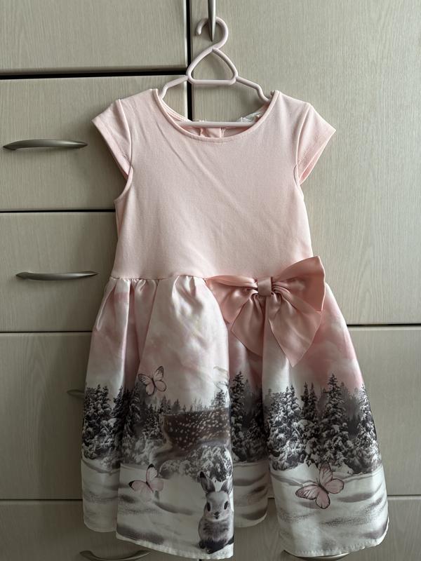 Фирменное нарядное платье для девочки, сзади на молнии, спереди красивый бант, очень нежный рисунок, размер указан 4-6 лет, пышное с подьюбником.