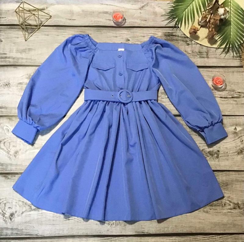 через кнопку купить только полная оплата!!; Стильное платье для модниц По переду пуговицы декоративные. Поясок в комплекте. Тканина- костюмна. Замеры: 158 общая длина - 91см, длина от заднего выреза - 83см, рукав - 63см, полуобхват груди - 45см. БЛАКИТНИЙ: Мс