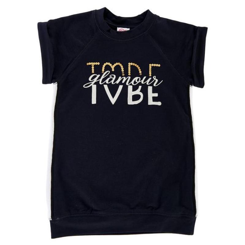 95%хлопок/5%эластан Платье Glamour с коротким рукавом, лампасами и круглым вырезом горловины. Особенности платья: спереди декорировано принтом с пайетками рукава с отворотами белые лампасы с серебряной люрексовой нитью низ - трикотадный мандет От принцессы до пацанки, независимо от ее стиля, каддой девочке нудно любимое платье...или десять!