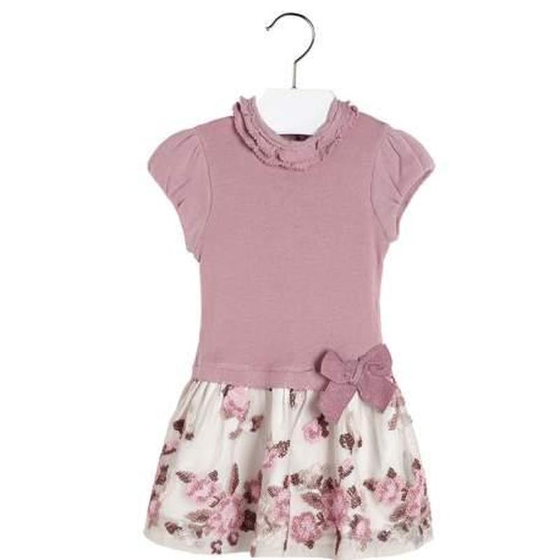 Розовое платье для девочки Mayoral 60%полиэстер/38%хлопок/2%эластан/подложка:95%хлопок/5%эластан платье для девочки Mayoral розового цвета с коротким рукавом, низ обработанный цветами.