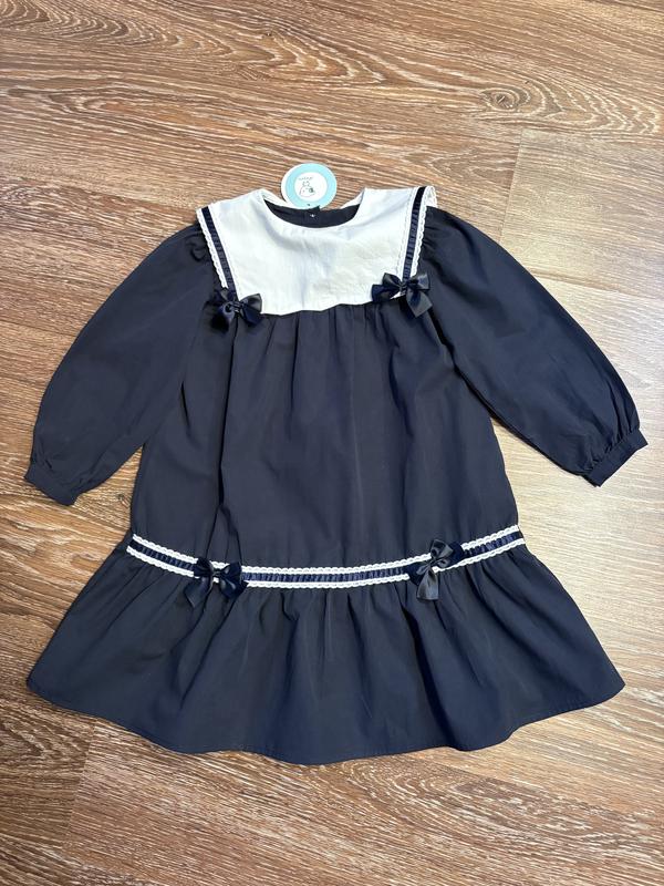 Нова бавовняна сукня темно синього кольору 116 розмір в морському стилі,великий білий комір позаду два ґудзика Заміри Довжина 60 см Рукав 40см Вільний крой в складі бавовна