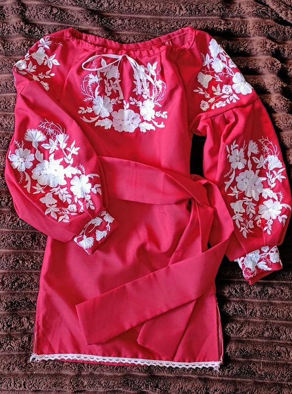 Платье вышиванка на девочку. Необыкновенно красивое, яркое красное. Стан идеален, неких дефектов. Машинная вышивка. Длина 63 см, пог 34 см, рукав от горловины 50 см. Ширина горловины регулируется шнурком.