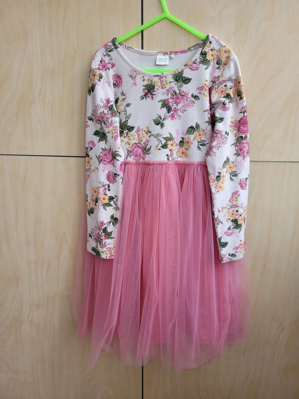 Платье next на 6-7 лет Хлопок все кроме фатина. Пог 32. Рукав от плеча 42. Длина 72. На фатине по спинке есть пятнышки. В носке совсем не видно. Показала на фото.Все другое отлично