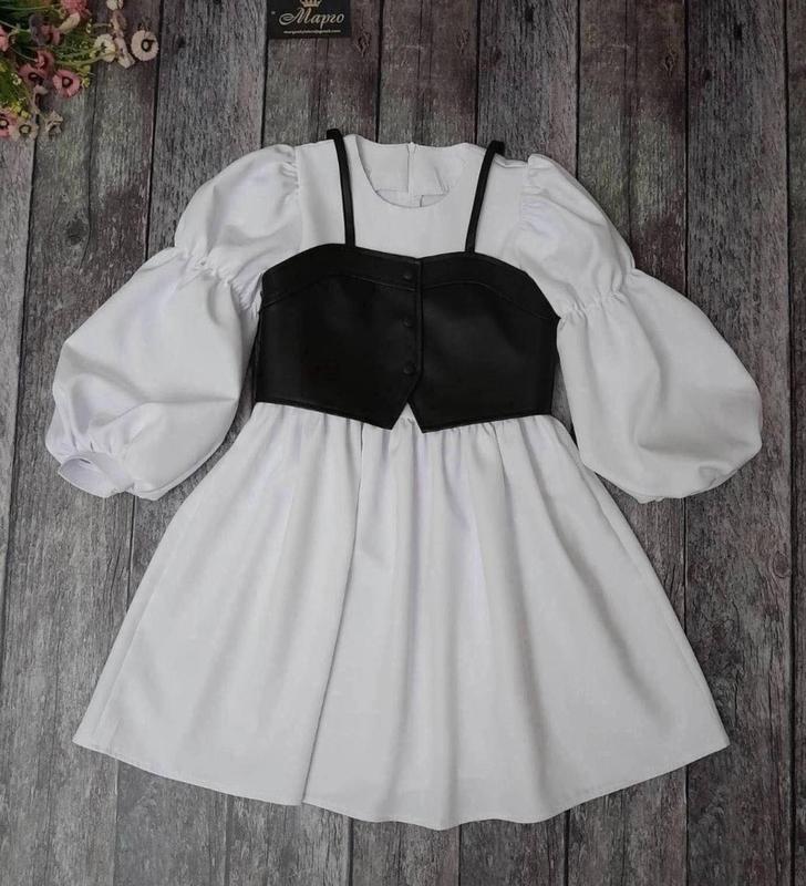 через кнопку купить только полная оплата!!! Стильное платье для модниц По спинке к поясу застегивается на молнию. Ткань костюмная, топ - экокожа. Сукня-МОЛОЧНА. 158 длина - 86см, рукав от горловины - 66см, полуобхват груди - 41см Мс