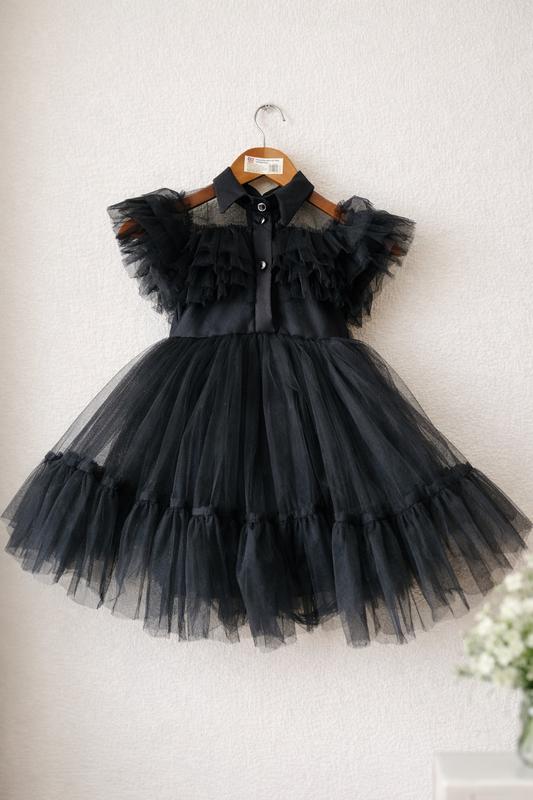 Сукня в стилі Венсдей на дівчинку 6 рочків. Якщо худенька, підійде і на 7. Шили на замовлення.Стан нового, без жодних дефектів,одягали на годину на фотосесію. В поясі 30 см, довжина від плеча до низу 68 см. Пишна юбка, тримає форму, 3 шари фатину та підʼюбник. В комплекті поясок