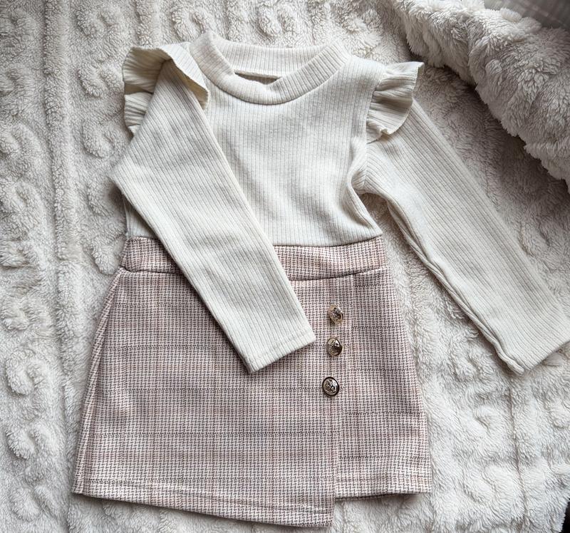 Ціна за дві речі Дитячий одяг, розмір 86 (1–1,5 роки) 1. Рожевий лонгслів у смужку з рюшами Ніжна трикотажна кофтинка у рожево-білу смужку, дизайн з об’ємними рюшами спереду. М’яка, приємна до тіла тканина, добре тягнеться. Ідеально підійде як на щодень, так і для святкового образу. Стан дуже хороший. 2. Сукня Стильна сукня для маленької модниці Молочний лонгслів у рубчик з рюшами на плечах + тепла спідничка в клітинку з декоративними ґудзиками. Гарно поєднується разом, виглядає дуже акуратно та ніжно. Підійде для садочка, прогулянок чи святкових подій. Стан відмінний. Розмір: 86 Охайний стан, без плям та дефектів.