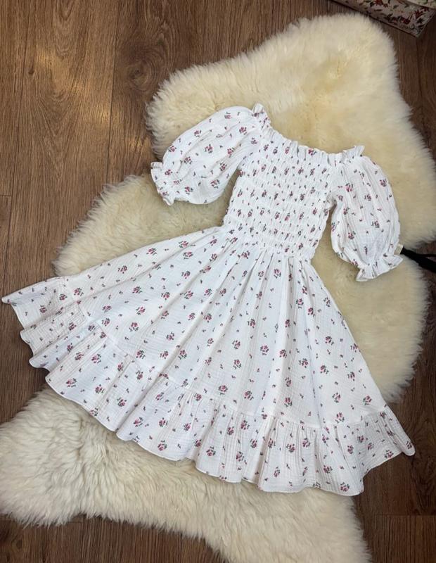 через кнопку купить только полная оплата!!! Стильное муслиновое платье для девушек Верхняя часть платья собрана, красиво тянется. Ткань - муслин (Турция). 140 длина от плеча - 72см, полуобхват груди - тянется до 40см. Мс