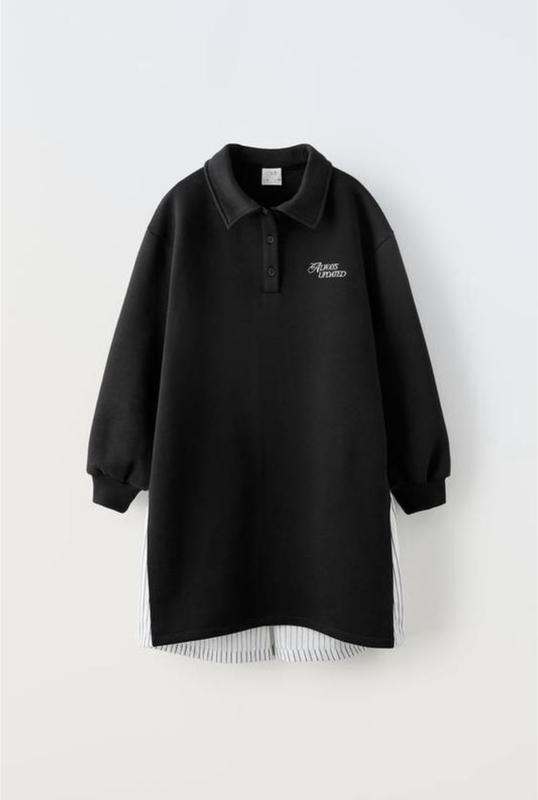 Сукня з коміром-поло та довгими рукавами. Напис на грудях, контрастна смугаста вставка ззаду та окантовка в рубчик по краях. ✅Плечі: 41 см ✅Рукав: 42 см ✅ПОГ: 41 см ✅ПОТ: 43 см ✅В стегнах вільно ✅Довжина: спереду 63 см, ззаду 73см Стан нового