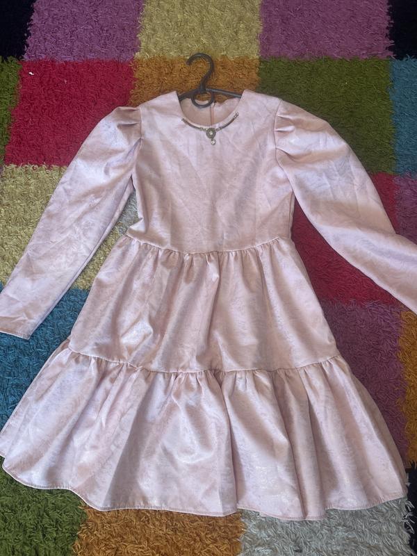 Сукня майже нова. Ніжний персиковий колір з блиском. Розмір 140-146. На замочку позаду.
