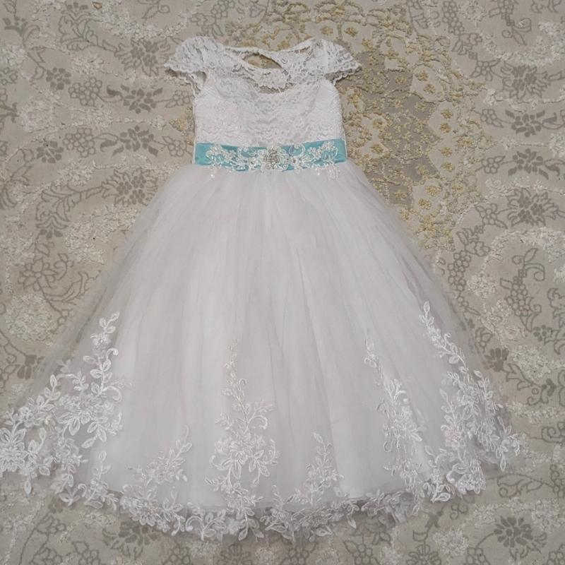 Платье было одето один раз на фотосессию девочке тогда было 6 лет. Ориентируйтесь на замеры. Длина 95, пояс 30. платье регулируется.