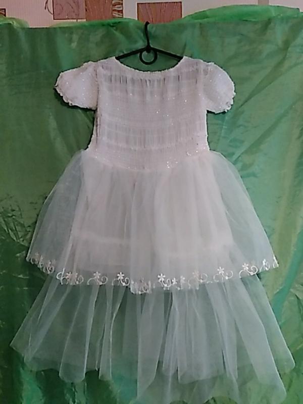 верх платья блестит при освещении и переливается рукав фонариком низ платья состоит из фатина в два слоя и подюпника