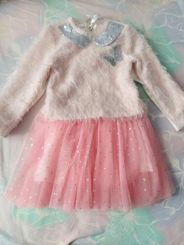 Дитячий комплект для дівчинки на зріст 98 см - сукня верх трикотаж, низ 2 кулі фатину з блискітками та підкладка. Кофта - м'яка травичка, з декорованим паєтками коміром і метеликом, ззаду атласна зав'язк