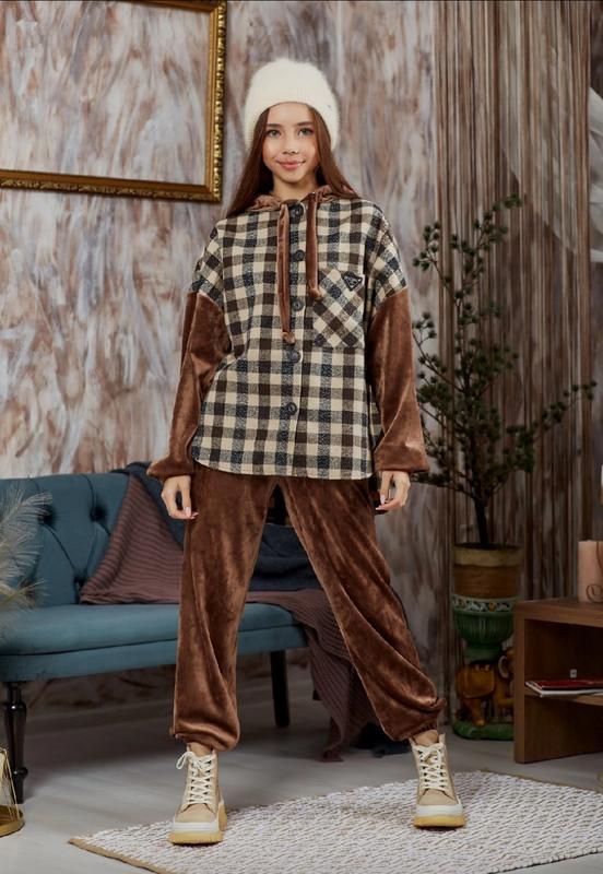 Модний костюмчик на дівчинку тканина королівський велюр , рубашка тепла вовна +велюр на гудзиках РЕКОМЕНДУЮ!!! 146(1 шт)-довжина рубашки по переду 59,рукав 68,пог 55,довжина штанів 87,крок 64,пояс 26 152(1 шт)-довжина рубашки по переду 62,рукав 71,пог 56,довжина штанів 91,крок 68,пояс 27