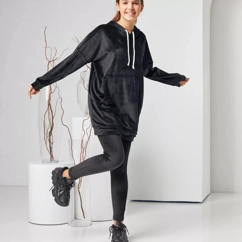 Ландыш Теплий і зручний велюровий костюмчик туніка+лосінки тканина велюр на хутрі туніка з капішоном і карманом кенгуру колір чорний РЕКОМЕНДУЮ! 140(1 шт)-довжина туніки 66,пог 50,рукав від горловини 56,довжина лосінок 84,крок 63,пояс 27 152(1 шт)-довжина туніки 71,пог 55,рукав від горловини 63,довжина лосінок 91,крок 67,пояс 29 +-2 см