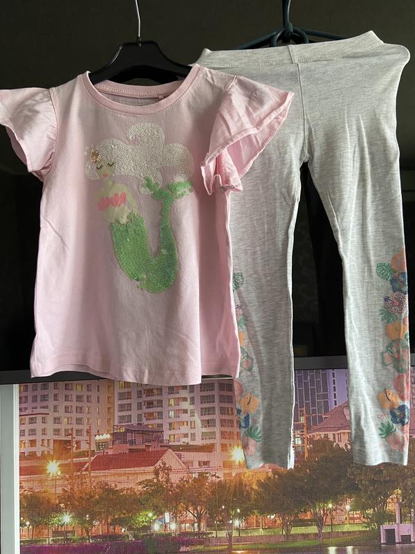 Набор 4/6 лет, сост хорошие, на футболке еле видно какие-то пятнышки, но не сильно, рисунок весь в паниках, нежный и оч красивый набор, 120 грн. Длина от плеча 41, ширина подмышки 32, рукав и плечо 13 Длины 60, шаг 41, пояс 23
