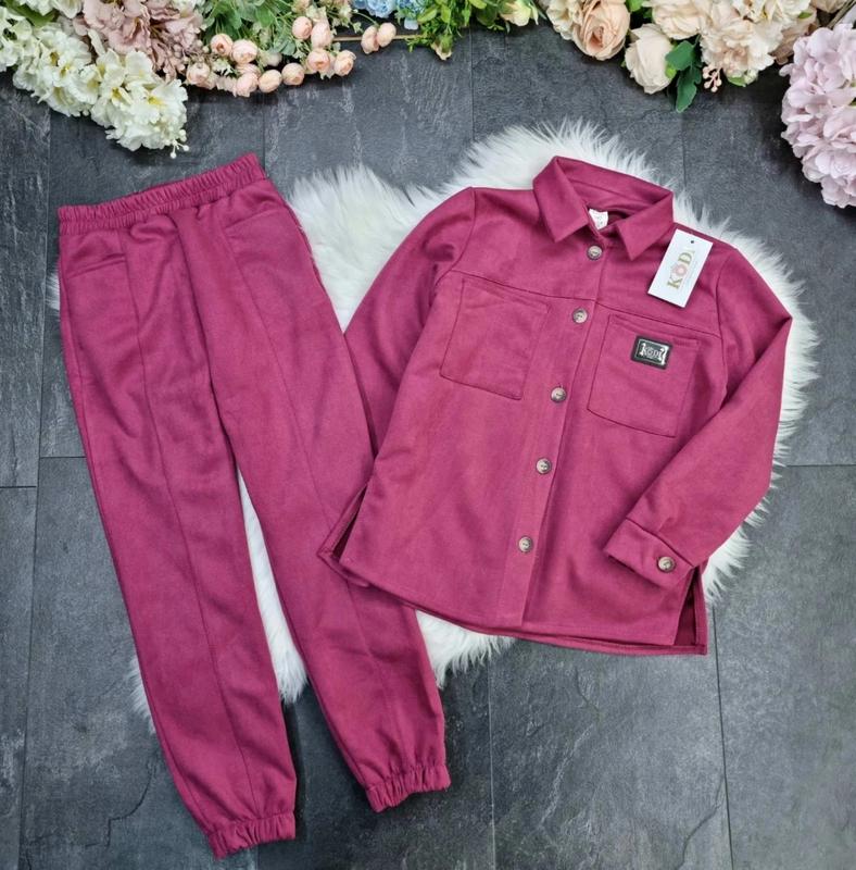 Стильна новиночка весни крутой костюм с рубашкой ткань замш, рубашка с карманами, штанинки низ на резинке, есть карманы размер/дл.сор/пог/рукав/дл.шта/крок/пот/поб 140/58/47/50/86/65/27/43 146/60/48/52/87/66/28/44 152/62/49/53/88/68/29/45 158/64/50/54/91/69/30/46 164/65/51/55/94/71/31/48 Аб