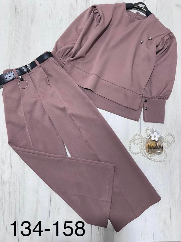 Таня НОВИНКА 🏺Модный костюм с брюками палаццо Тканина костюмка В брюках есть кармашки, поясок в комплекті 🏺Кофта по низу застегивается на пуговицу РЕКОМЕНДУЮ!!! размер/🏺длина кофты спереди/пог/рукав/🏺брюки длина/шар/пот/поб 134/🏺50/41/44/🏺87/62/27/41-1шт 140/🏺52/43/45/🏺89/64/28/43-1шт 146/🏺54/48/46/🏺92/66/29/45-1шт 158/🏺58/51/48/🏺98/71/31/49-1шт +-2см