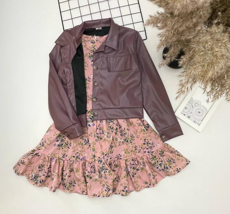 Таня арт 1780 НОВИНКА! 🍰Модный комплект для девочки Ткань куртка эко кожа, сукня софт 🍰платье под поясок по спинке молния рукавчик под резиночку рекомендую!!! размер/🍰долж. платья/пог/рукав/🍰длина куртки/пог/рукав 134/🍰67/31/46/🍰40/39/47-1шт 140/🍰70/32/48/🍰42/40/49-1шт 146/🍰73/33/50/🍰44/41/51-1шт 152/🍰77/34/52/🍰45/41/52-1шт 158/🍰81/35/54/🍰46/42/55-1шт +-2см