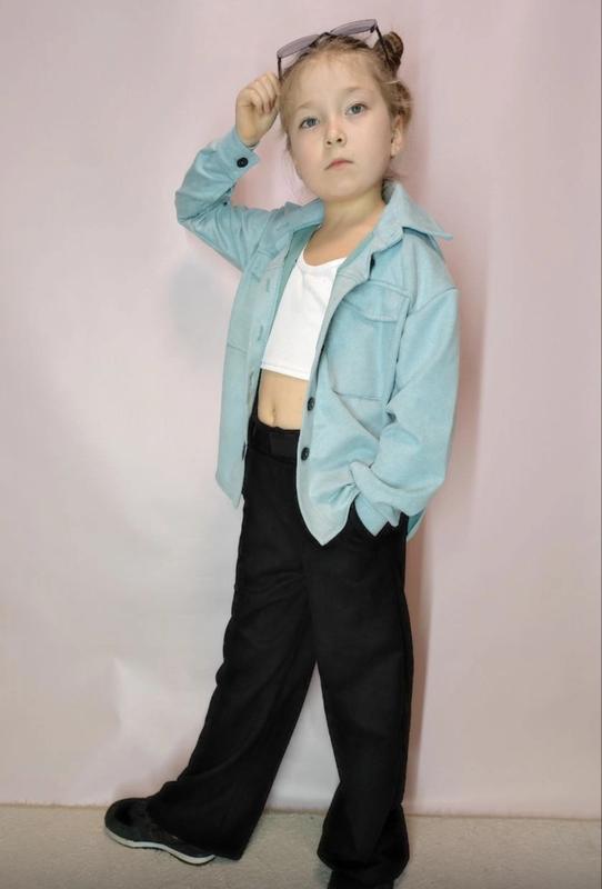 Стильный костюм для девочки Ткань замш диагональ Рубашка удлиненная, на пуговицах Штаны палаццо, в поясе на резинке. Длина рубашки (спереди, потому что сзади длиннее на 2-4 см)/пог/рукав от горловины/длина брюк/шарик/резинка 📌128-48/42/59/77/54/26 📌134-50/44/60/81/56/26