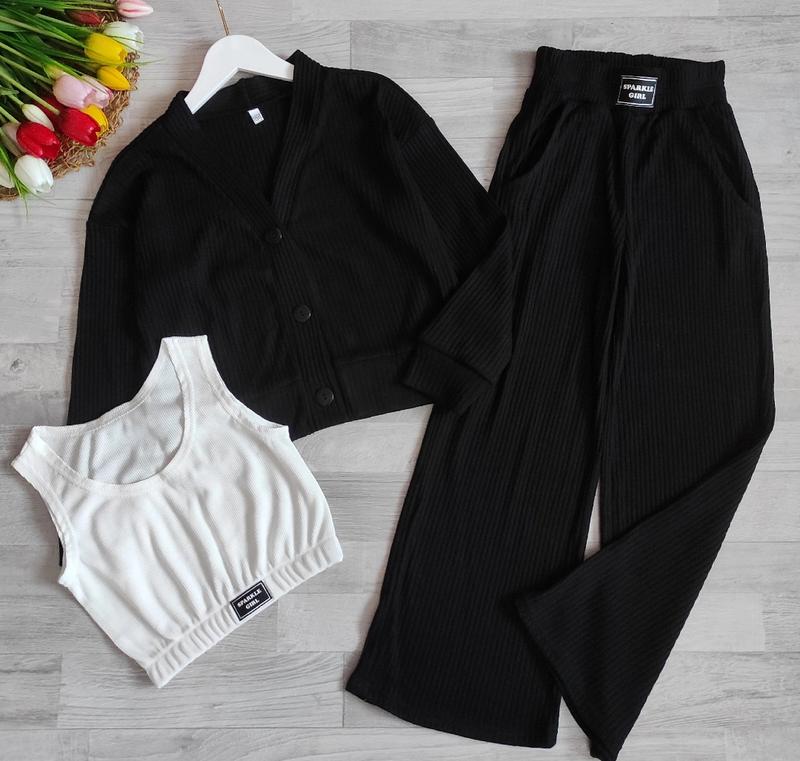 Костюм тройка ткань ангора рубчик Турецкий кашемир кофтинка застегивается на пуговицы, в брюках есть кармашки замеры: длина кофты/пог/рукав от горловины/длина топа/пог/длина палаццо/крок/пот/поб 128-42/43/52/30/33/77/54/24/36 134-43/45/55/33/34/84/58/25/40 +-2см