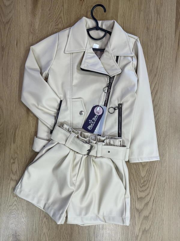 В НАЯВНОСТІ Крутой комплект кожаные шорты+косуха ткань косухи экокожа на подкладке с кармашками на замочке внизу с поясом шорты с поясом и карманами 128(2 шт)-длина косухи 46, пог 36,рукав 44, длина шорт 28,пояс 22 +-2 см