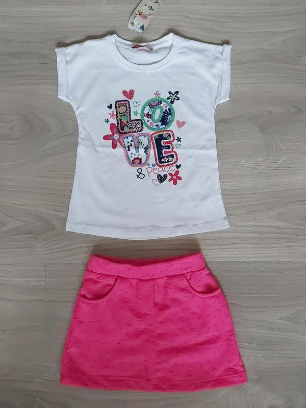 Очень красивый яркий костюм с розовой юбкой. В костюм входит футболка белого цвета с принтом и юбкой розового цвета меланж. Юбка в поясе на широкой резинке, что делает ее очень комфортной, также на юбке есть карманы. Материал хлопок. Производитель Турция фирма Wanex