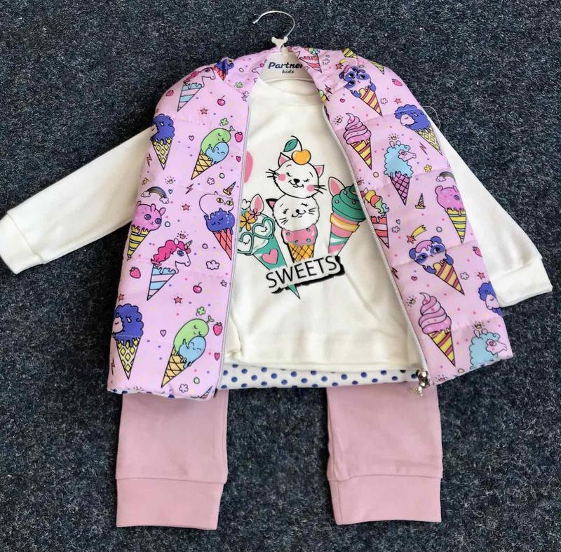 Шикарная тройка для девочки . Состоит из жилетки, реглана и штанов. Производство Турция. Состав 95% хлопок, 5% лайкра. Замеры : 12/18 м - Длина реглана 34 см, ширина 27 см, рукав 27 см, длина штанов 40 см, длина жилетки 33 см; ПРОДАНО 18/24 м - Длина реглана 36 см, ширина 28 см, рукав 30 см, длина штанов 43 см, длина жилетки 34 см;