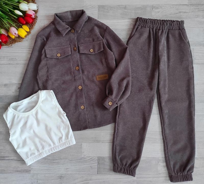 Крутезный костюм тройка для девочки рубашка+ топ+ штани джогери тканина вельвет,топ хлопок РЕКОМЕНДУЮ замеры: длина рубашки/пог/длина рукава от плеча/ длина топа/ ширина/ длина брюк/шарик/бедра/ пояс 128-134-58/46/47/30/33/79/54/40/24