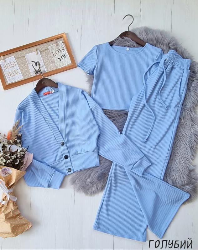 комплект тройка, футболка-топ+жакет+палаццо тканина трикотаж рубчик брюки с карманами, в талии под широкую резинку высокая посадка 164(1 шт)-длина жакета 48, пог 51,рукав от горловины 69,дов.топ 42, пог 42, длина брюк 104,шаг 76,пояс 30, поб 55 +-2 см
