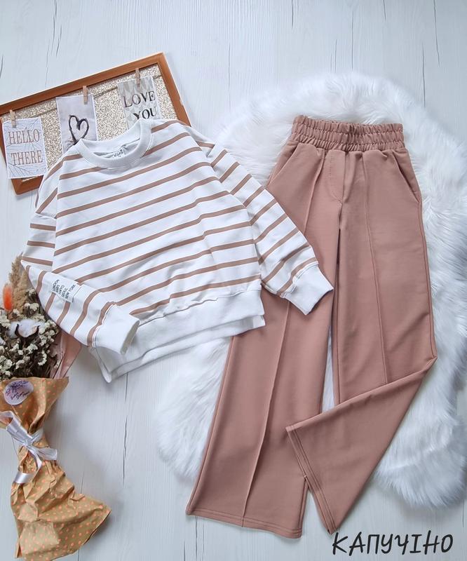 Крута новинка цьго сезону!! полоскатый свитшот+ штаны палаццо ткань турецкая двунитка качество супер РЕКОМЕНДУЮ! 134(2 шт)-длина свитшота 46, пог 56,рукав от горловины 56,длина брюк 82, крок 62,пот 28 140(2 шт)-длина свитшота 47, пог 59,рукав от горловины 59, длина брюк 88, крок 65,пот 28 146(1 шт)-длина свитшота 48, пог 60,рукав от горловины 60,длина брюк 92, крок 67,пот 29 152(2 шт)-длина свитшота 51, пог 64,рукав от горловины 65,длина брюк 96,шаг 71,пот 30 158(2 шт)-длина свитшота 54, пог 67,рукав от горловины 67,длина брюк 100, крок 75,пот 31 +-2 см Цена 980 грн