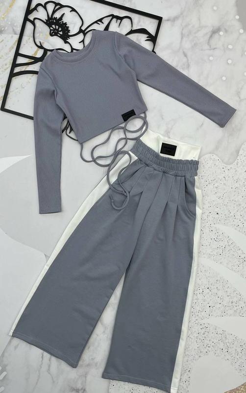 Гарний костюм для дівчинки Штани палаццо двонитка з високою талією Дуже стильно виглядає Топ мустанг рубчик, на зав’язках Якість чудова! Довжина кофтинки/Пог/рукав/довжина штанів з білою резинкою/крок/резинка 128-29/31/47/84/58/24 134-31/32/49/88/60/26 140-32/33/51/91/63/27 146-34/34/53/93/66/27 152-35/36/55/98/68/28