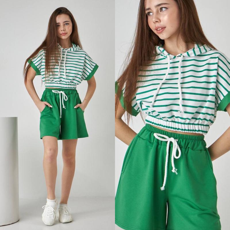Летний костюм тканина двонитка красивый и удобный топ с капюшоном шорты с карманами Хорошее качество! размер/длин. топа/ширина по резинке/длин. шорт/пот похибка+-2см 140/34/29/34/27-1шт 146/35/39/35/28-2шт 152/36/31/37/28-2шт