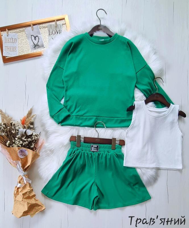 Костюмчик 3-ка кофтинка+шорти+топ тканина трикотаж рубчик В шортах есть карманы ГАРНАЯ КАЧЕСТВО! 134(2 шт)-длина кофты 48, пог 45,рукав от горловины 55, длина топа 34, пог 33, длина шорт 35,пояс 26 140(2 шт)-длина кофты 50, пог 46,рукав от горловины 57, длина топа 35, пог 34, длина шорт 36,пояс 27 146(2 шт)-длина кофты 51,пог 47,рукав от горловины 60,длина топа 36, пог 35, длина шорт 37,пояс 28 152(2 шт)-длина кофты 54,пог 48,рукав от горловины 62, длина топа 37, пог 36, длина шорт 38,пояс 29 158(1 шт)-длина кофты 56,пог 49,рукав от горловины 65,длина топа 38, пог 37, длина шорт 39,пояс 30 +-2 см
