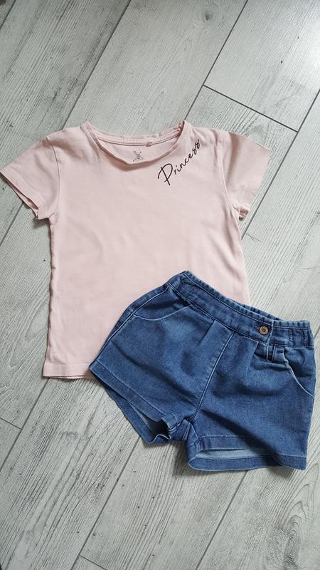 Набор комплект костюм на лето для девочки. Шорты из хлопка под джинс Next. Ткань мягкая, на талии резинка и утяжка. Размер указан 2-3, можно и на больше. Футболка нежно розового цвета River Island. Короткий рукав, небольшой круглый вырез горловины.