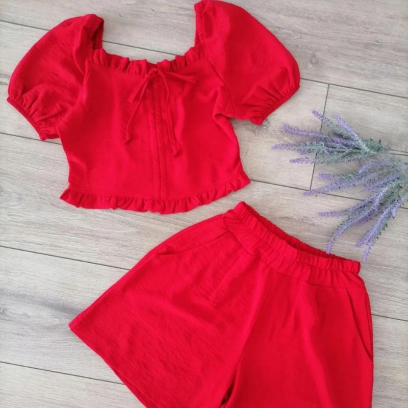 3 кольори 5 фото для прикладу який вигляд на спинці (кольору немає в наявності) Топ і шорти пошиті з американського крепу. На спинці топа прострочені строчки ниткою-резинкою, за рахунок цього легко одягати. Топ впереді стягується на шнуровку, можна регулірувати довжину топа. В шортах є кишені. Заміри: БІЛИЙ. ЧЕРВОНИЙ 140 шорти довжина - 36см, пояс - 25см, напівобхват бедер - 50см. блуза довжина попереду посередині - 26см, напівобхват грудей - 36см. БІЛИЙ. ЛІЛОВИЙ. 146 шорти довжина - 37см, пояс - 25см, напівобхват бедер - 52см. блуза довжина попереду посередині - 28см, напівобхват грудей - 37см. ЧЕРВОНИЙ. ЛІЛОВИЙ. 158 шорти довжина - 39см, пояс - 27см, напівобхват бедер - 55см. блуза довжина попереду посередині - 30см, напівобхват грудей - 39см. 🌴