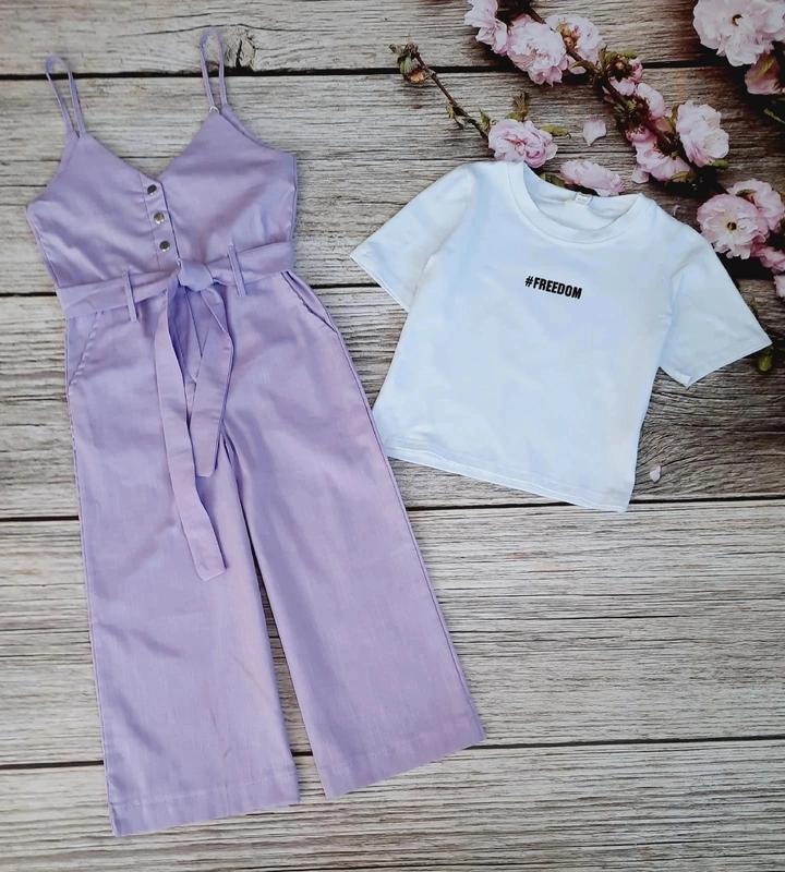 Ира б НОВИНКА Мега стильний комплект для модниці (футболка+комбез- кюлоти) Тканина футболка турецький супрем,комбез льон стрейч В комбезі є кишеньки, застібається на кнопки,поясок в комплекті Талія завишена ЯКІСТЬ ЧУДОВА! РЕКОМЕНДУЮ! заміри:футболка довж/пог-комбез довж з бретельками/пог/крок/поб 134р-37/34-95/31/42/35 140р-40/37-100/33/44/36 146р-44/38-105/34/47/38 152р-45/39-107/35/48/39 158р-48/41-114/37/53/41 164р-50/42-120/39/55/44 +-2см