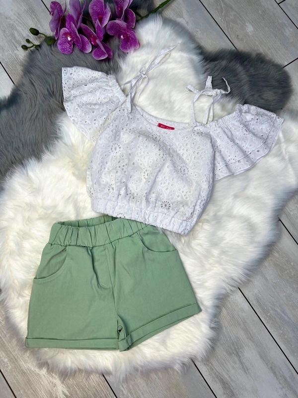 Бомбезный костюм, Блуза из прошвы шортики стрейч коттон укороченная блуза с пышным рукавчиком пояс на резиночке. Цена 890 грн 146-1 шт 158-1 шт Длина/пог/длина/пояс 140-28/34/29/26 146-29/36/30/27 152-30/38/31/28 158-32/39/32/28 164-33/40/33/29