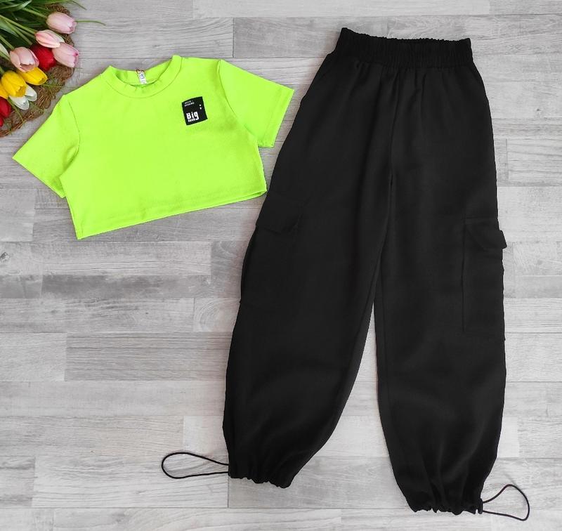 Костюм двійка, футболка-топ(тканина рубчик) та штани карго,тканина котон пояс на резинці,внизу стягуються,є резинка та фіксатор РЕКОМЕНДУЮ заміри:довжина топа/пог/карго довжина/крок/пояс 128-29/35/8**********/36/90/64/27