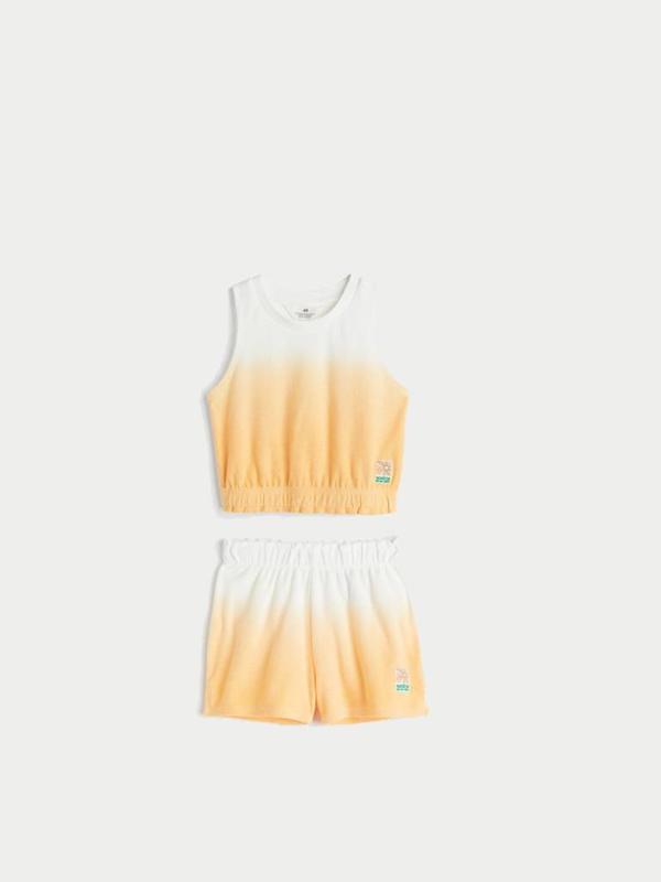 Стильный летний костюм для девочек от H&M! Оригинальная расцветка! Белый цвет переходит в оранжевый. Мягенький на ощупь, приятный к телу. Топ внизу на резинке. Шорты без карманов, пояс на мягкой резинке, по бокам маленькие разрезики. Состав: хлопок- 77%, полиэстер- 23%. Размеры в наличии: - 11-12 лет/ 152 см; - 13-14 лет/ 164 см. Отправка Новой почтой и Укрпочтой.
