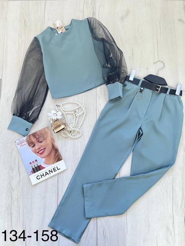 тканина костюмка в брючках есть карманы пояс в комплекті рукавчик евро-сетка 134-длина 37, пог 38,рукав 48,длина брюк 82,шаг 58,пояс 26,поб 41 140-длина 38, пог 39,рукав 51,длина брюк 84,шар 60,пояс 27, поб 43 146-длина 40,пог 40,рукав 54,длина брюк 87, крок 62,пояс 28, поб 44 152-длина 42,пог 43,рукав 56,длина брюк 89, крок 63,пояс 30, поб 45 158-длина 46, пог 45,рукав 59,длина брюк 93,шаг 67,пояс 31, поб 47 +-2 см