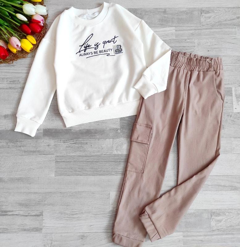 Крутой костюмчик двойка тканина кофточки турецька двухнитка,штани джоггери тканина стрейч джинс в брюках есть кармашки, в поясе широкая резинка, красиво тянется замеры: длина/рукав/пог/брюки длина/шаг/пояс 122-44/52/35/73/50/26