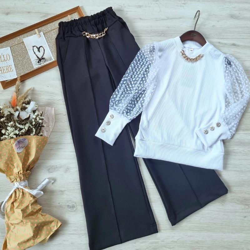 Ландыш Стильний костюмчик брюки палаццо+кофтинка брюки виконаны з тканини алекс, кофтина рубчик+евро-сітка прикрашені ланцюжком 134(2 шт)-довжина кофти 50,пог 36,рукав 45,довжина штанів 81,крок 61,пояс 25 158(1 шт)-довжина кофти 55,пог 42,рукав 55,довжина штанів 98,крок 76,пояс 29 +-2 см