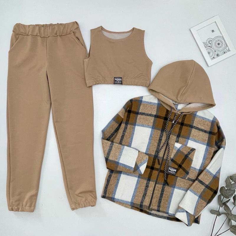 Таня Костюм тройка Сорочка+топ+штани Рубашка застегивается на молнию в брюках есть карманы Ткань турецкая двухнить пенье рубашка - байка Клетка может быть другая Рекомендую рост/длин.рубашки/пог/рукав от горловины/длин.топа/пог/длин.штанов/крок/пот Похибка +-2см 134/46/46/56/25/32/77/56/25-3шт